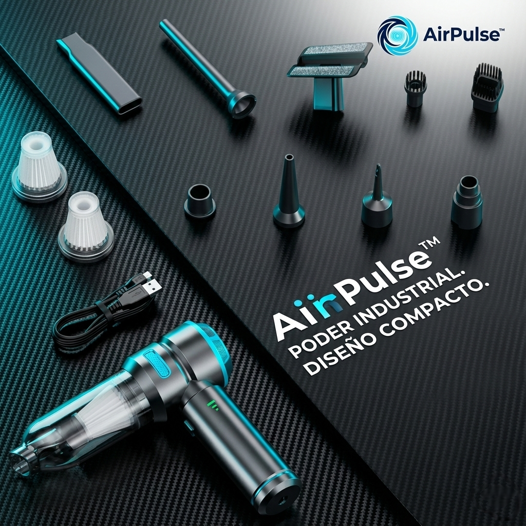 El AirPulse™ combina 22.000 PA de potencia con la doble función aspirar + soplar, alcanzando rincones donde los aspiradores comunes no llegan. Elimina migas, polvo y suciedad profunda en segundos, sin cables y con accesorios que aumentan la precisión. Es ideal para coche, oficina y hogar.